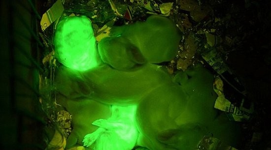 在紫外线照射下,这种经过基因改造的兔子能够发光。