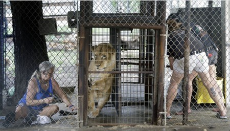 In-Sync Exotics野生动物救援及教育中心的发言人Lisa Williams正在检查一只感染了犬瘟热的狮子。
