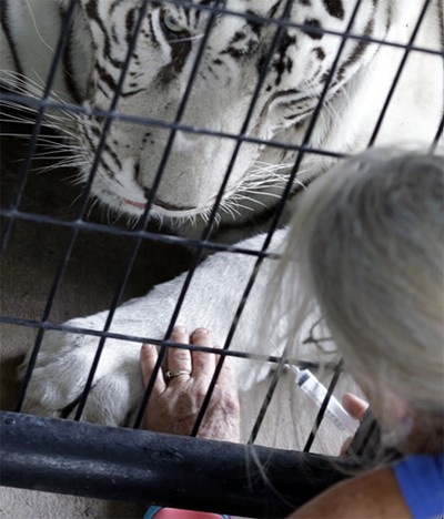 In-Sync Exotics野生动物救援及教育中心创始人Vicky Keahey为一头患犬瘟热的老虎取血样。