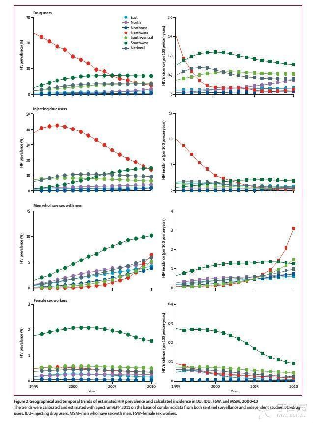 2010年,全国注射毒品者HIV患病率为9.08% ,女性性工作者HIV患病率为0.36 %,而两类人群中的发病率分别稳定在0.57和0.02 每100人年。通过对比,男男性行为者HIV的患病率从2000年的1.77% 增加至2010年的5.98 %,2010年全国的发病率为0.98每100人年。研究发现每个省HIV流行与高危人群之间紧密相关,证实这些群体高危行为的重叠和混合。