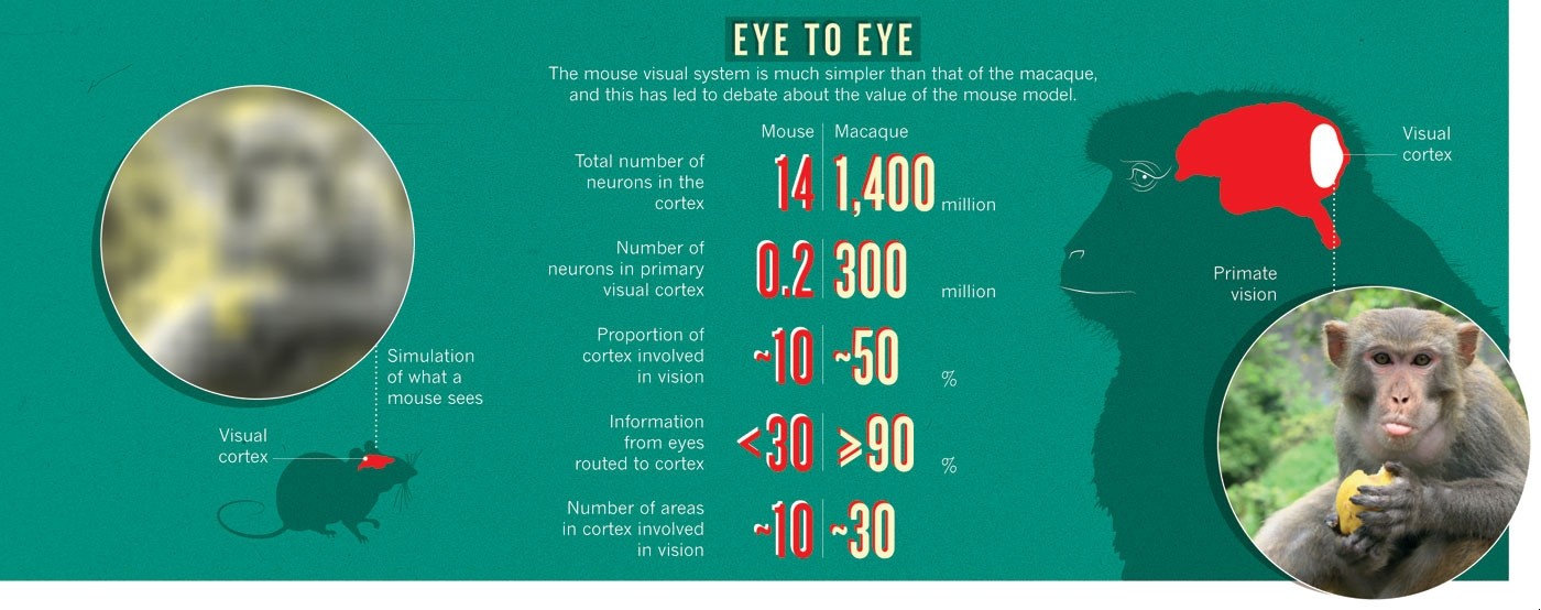 但是也有人表示,小鼠和人类之间的相似之处大于差异。小鼠的视觉皮层包含与人类相同的神经类型、相同的种类比例,以及相同的作用机制。在进化关系上,老鼠与人类的亲缘关系比猫更近。事实上,小鼠的大脑区域相比猴子和猫更易于处理。