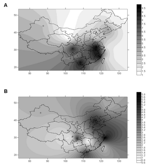 我国mtDNA单倍型类群B5频率分布(A)与AD流行率(B)有部分重叠效应