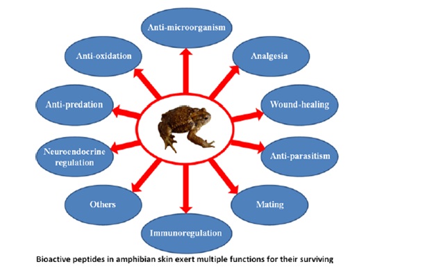 两栖动物皮肤裸露,他们常常受到生物因子或者非生物因子的浸袭(如微生物、寄生虫、猎食者、辐射及其他物理伤害),两栖动物皮肤中含有大量的活性多肽对应对环境威胁具有重要作用。