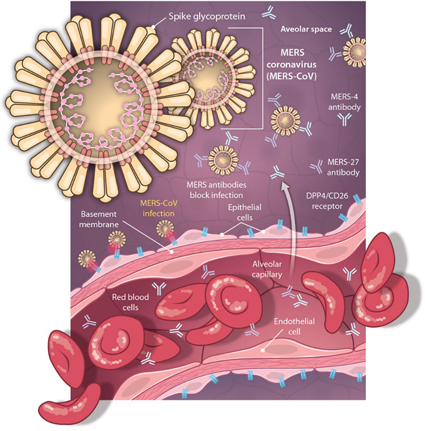 图2 抗MERS冠状病毒中和抗体的作用机制 自2013年底开始,课题组又专注于第二代抗MERS冠状病毒的人源单克隆抗体MERS-4s的研究,并取得了重大进展。目前的研究进展中,不仅保持了原有抗体的高亲和力和中和活性,而且抗体表达量有望提高10倍,为进一步开展动物实验和临床应用奠定了坚实的基础。 同时,课题组还将MERS-4s和MERS-27两株抗体进一步优化,正在构建表达双特异性抗体。双特异性抗体不仅具有高效的中和活性,同时还能够中和病毒突变株,其性能在抗病毒广谱性方面将得到显著的提高。 张林琦教授和王新泉教授领导的研究团队,正在全力推进人源单克隆抗体以及表位疫苗的动物实验和临床研究,尽快为高危人群和感染者提供一条快速有效的抗MERS冠状病毒预防和治疗措施,有效阻断MERS冠状病毒在我国和世界的进一步传播。