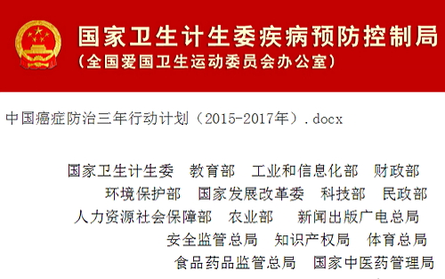 (一)履行部门职责,落实综合措施。卫生计生部门负责制订癌症防治规划、规范、技术标准,做好癌症防治工作的组织协调、技术指导、健康教育、预防诊治和监测评估;发展改革部门将癌症等慢性病防治相关内容纳入国民经济和社会发展规划,加强癌症医疗救治服务能力建设,促进防治药物研发和产业化;教育部门将癌症等慢性病预防相关知识纳入中小学健康教育内容;科技部门牵头通过国家和地方相关科技计划(专项、基金等)对癌症防治研究进行支持;工业和信息化部门加强控烟履约协调工作,推进抗肿瘤药的仿制创新和相关成果的产业化;民政部门进一步完善贫困癌症患者及家庭的医疗救助政策,加大救助力度;财政部门安排有关经费,加强资金管理和监督;人力资源社会保障和卫生计生部门积极完善医疗保险政策,落实包括癌症患者在内参保人员的保障待遇;环境保护部门加强环境监测和污染治理,优先整治易于导致人群健康损害的环境污染;农业部门引导农业产业结构调整和农产品品质改善;新闻出版广电部门组织广播、电视等主要媒体科学传播癌症防治知识;体育部门推广全民健身运动,加强群众性体育活动的科学指导;安全监管部门监督用人单位对可能导致职业性肿瘤的危害因素进行辨识,加强对相关作业场所和个人防护情况的监督检查;食品药品监管部门加强抗肿瘤药品生产流通的监管,加快专利即将到期抗肿瘤药物仿制创新的审批;知识产权部门负责抗肿瘤药品专利审批和保护;中医药管理部门指导医疗机构开展癌症中医药防治工作,推广应用中医药防治癌症的技术和方法。