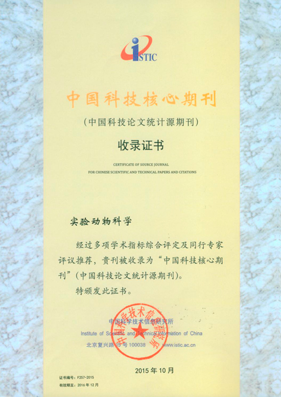 2015 年10 月21 日,在北京国际会议中心召开的“2015 中国科技论文统计结果发布会”上,国家科技部中国科学技术信息研究所研制的2015 年版《中国科技期刊引证报告(核心版)》同日发布。经过多项学术指标综合评定和同行专家推荐,《实验动物科学》继2005年首次被收录为"中国科技核心期刊"以来,2015 年再次获此殊荣。 同日,该刊编辑部收到了中国科学技术信息研究所颁发的"中国科技论文统计源期刊(中国科技核心期刊)"收录证书。 衷心感谢广大专家学者、作者和读者多年来对本刊的信任和支持。《实验动物科学》编辑部将会一如既往地不断提高本刊的质量和影响力,更好地为生物医药科研创新和广大科技人员服务。