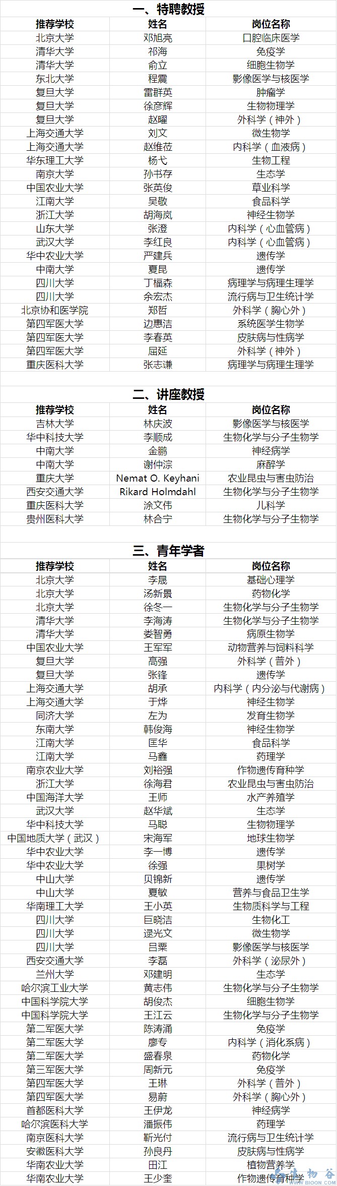 根据《教育部关于印发〈“长江学者奖励计划”实施办法〉的通知》(教人〔2011〕10号)有关规定和做好2015年度“长江学者奖励计划”人选申报工作的有关要求,经学校推荐、通讯评审、会议答辩、人选公示、评审委员会审定、聘任合同签订等程序,确定北京大学邓旭亮等412人为2015年度长江学者特聘教授(152人)、讲座教授(49人)、青年学者(211人)。现小编整理了生物医药类的获得者,如下: