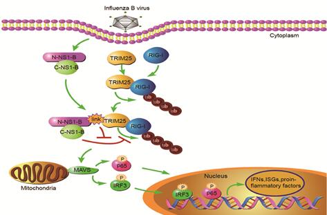 在病毒感染早期宿主细胞为了应对病毒的入侵和复制,迅速产生大量Ⅰ型和Ⅲ型干扰素以及前炎症因子等细胞因子。在敲除RIG-I 基因的细胞中,B型流感病毒感染后RIG-I下游通路的转录因子NF-κB、IRF3和STAT1的磷酸化水平及细胞因子表达量显著下调,显示B型流感病毒诱导的天然免疫反应是RIG-I通路依赖型。进一步研究证实,B型流感病毒感染早期引起的RIG-I及其E3泛素连接酶TRIM25更多地定位于线粒体,并且RIG-I迅速发生Lys63位聚泛素化修饰。同时,B型流感病毒NS1蛋白并不与RIG-I发生相互作用,但与TRIM25存在相互作用,并且TRIM25通过和B型流感病毒NS1蛋白N端(N-NS1-B)结合,与RIG-I形成RIG-I/TRIM25/NS1-B复合物,阻止了NS1-B C端(C-NS1-B)对RIG-I泛素化的抑制,从而保证RIG-I迅速发生泛素化修饰,导致抗病毒信号通路活化,产生大量细胞因子。而微生物所刘文军课题组前期研究的A型流感病毒NS1蛋白能够与RIG-I结合抑制RIG-I对dsRNA的识别,同时也能和TRIM25结合来抑制TRIM25对RIG-I的Lys63位连接的泛素化修饰,从而抑制RIG-I介导的抗病毒信号通路的激活。