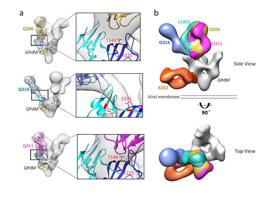 抗体Q206、Q314、Q411与埃博拉膜蛋白GPdM结合的单颗粒冷冻电镜结构