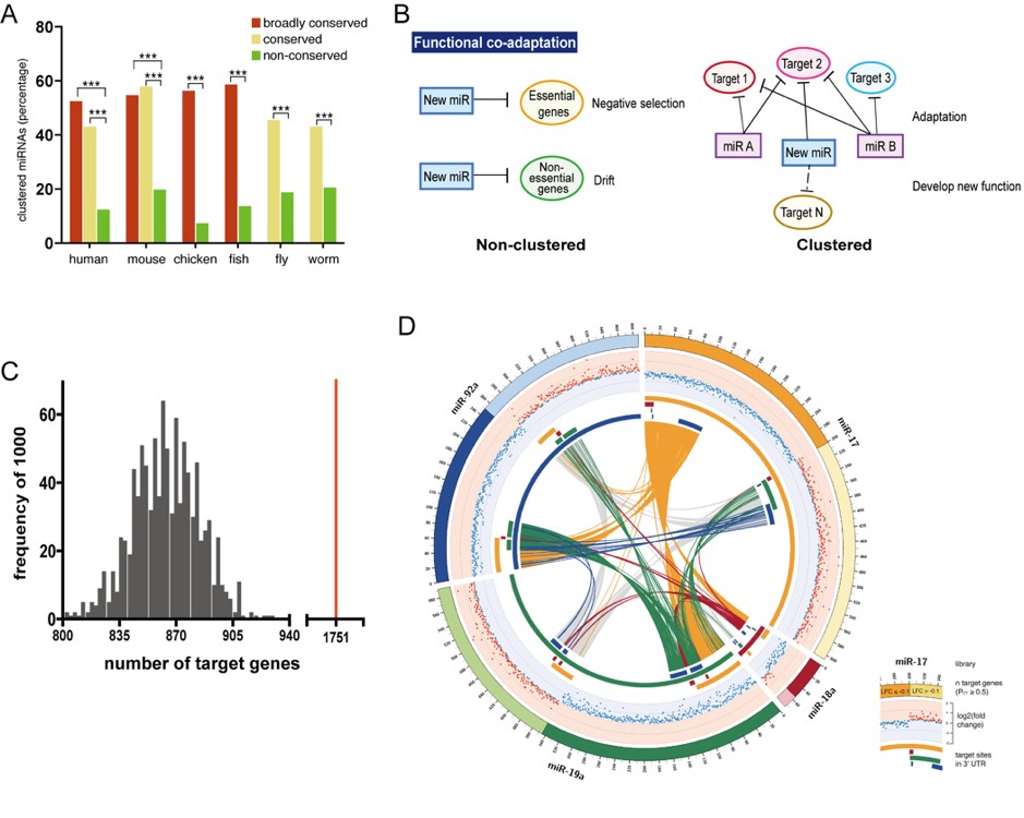 A不同保守程度中miRNA成簇分布的百分比;B功能共适应模型示意图;C同时被同一miRNA簇中两个以上不同种子序列的miRNA调控的靶基因数目;D分别过表达miR-17~92中四个不同种子序列的miRNA引起的靶基因变化。
