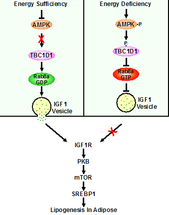 该论文利用细胞生物学和生物化学方法结合基因工程小鼠模型,对能量过剩导致肥胖的分子机制进行了系统研究。腺苷酸激活的蛋白激酶(AMPK)是细胞的能量感受器:能量过剩时如缺乏运动或过多能量摄入,AMPK活性会被抑制;而能量缺乏时,AMPK会被激活。本文作者发现AMPK激活可抑制细胞分泌胰岛素样生长因子-1(IGF-1)。其机制是AMPK磷酸化RabGAP蛋白TBC1D1上的丝氨酸231位点(Ser231),抑制其GAP活性,从而减少下游分子开关Rab8a的GDP装载形式;而GDP装载的Rab8a可以促进细胞分泌IGF-1。当在小鼠体内利用基因工程手段将TBC1D1上231位的丝氨酸突变为非磷酸化的丙氨酸时,IGF-1分泌增加致使小鼠中IGF1R-PKB-mTOR通路活化,进而促进生长和脂质合成,导致小鼠罹患肥胖;而肥胖又进一步致使TBC1D1Ser231Ala基因敲入小鼠发生糖尿病和脂肪肝。该研究阐明了AMPK-TBC1D1-Rab8a-IGF-1通路在体内能量状态感知与肥胖发生中的作用机制,为今后干预和治疗肥胖提供了新靶点和新思路。