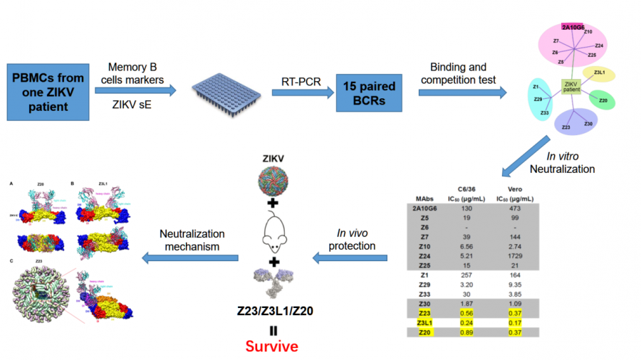 ZIKV表面含有E蛋白(Envelope),含有三个不同的结构域(DI, DII和DIII)是负责受体识别与膜融合的重要蛋白,含有产生中和抗体的重要表位。研究团队从一例南美输入病例入手,采集其康复后的血液并分离PBMCs,然后以ZIKV E蛋白为诱饵从PBMCs中分选到33个结合E蛋白的记忆性B细胞,并且鉴定出其中14个B细胞的抗体序列。表达、纯化这些抗体后,进行一系列的功能验证。首先,ELISA、SPR实验证明有13株抗体结合E蛋白,亲和力相差较大 (KD=10-6~10-11M);竞争实验表明13株抗体结合在E蛋白的至少5个不同表位。其次,细胞水平的体外中和实验表明,结合其中3个表位的抗体具有高中和活性(IC50=0.17~1.87 μg/ml);动物水平(小鼠感染模型)的体内功能检测发现三个不同表位的高中和活性抗体(Z20, Z3L1和Z23)分别可以完全保护小鼠。最后,利用结构生物学手段,阐明三株保护性抗体与E蛋白的结合模式并揭示其作用机制。其中,Z20同时结合E蛋白二聚体中相邻E蛋白的DII,Z3L1主要结合E蛋白二聚体中一个E蛋白的DI以及DI与DII的连接区域,Z23主要结合DIII,同时插入到相邻两个E蛋白二聚体的沟槽中。三株抗体通过结合E蛋白的不同结构域影响膜融合过程中E蛋白构象变化从而影响病毒感染,同时Z23也有可能阻断ZIKV与受体的结合进而阻止ZIKV感染。其中,两株抗体(Z3L1和Z23)特异性阻断ZIKV感染,对于登革热等黄病毒没有交叉反应,有望进一步开发成药物,相关临床前研究正在进行并获得专利保护,为人类防治ZIKV提供了重要的抗体药物支撑。