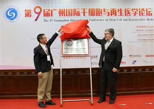 中科院广州生物院院长裴端卿(左)与德国马克斯普朗克学会分子医学研究所所长汉斯席勒教授为再生生物医学联合研究中心揭牌。