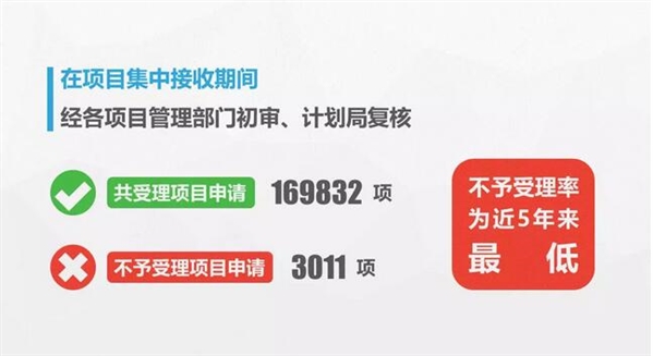 受理情况在项目集中接收期间,经各项目管理部门初审、计划局复核,共受理项目申请169832项,不予受理项目申请3011项,占申请总数172843项的1.74%,不予受理率为近5年来最低。