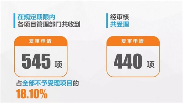 不予受理项目复审申请及审查情况在规定期限内,各项目管理部门共收到复审申请545项,占全部不予受理项目(3011项)的18.10%。经审核,共受理复审申请440项。