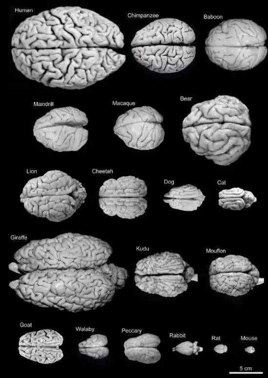 动物大脑比较左上角人类大脑,右下角实验小鼠大脑,(DeFelipe 2011)