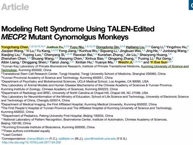 瑞特综合征(Rett syndrome)属于自闭症谱系范畴的神经发育性疾病,超过95%的瑞特综合征患儿携带MECP2基因突变。2017年5月18日,来自昆明理工大学、云南省灵长类生物医学重点实验室季维智、陈永昌研究团队和同济大学医学院孙毅团队在Cell杂志发表了题为“Modeling Rett Syndrome Using TALEN-Edited MECP2 Mutant Cynomolgus Monkeys”的研究论文。运用TALEN技术开展食蟹猴瑞特综合征模型的研究,论文首次建立基于基因编辑的非人灵长类疾病模型,同时成功地利用基因编辑非人灵长类模型,从行为模式、病理发生及其机制开展的系统性研究工作,对未来更深入地开展瑞特综合征发病机理研究和探索临床有效干预方法将产生深刻影响。本文作者中科院神经所研究员仇子龙从瑞特综合征的由来写起,再到对季维智、孙毅等老师在这一领域的工作以及本次研究的评述,其中穿插个人与几位研究者的交集以及对这一领域的理解,娓娓道来。