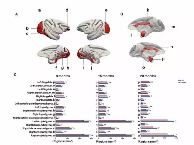 研究者接着与中科院自动化所蒋田仔研究员合作,运用核磁共振成像的方法研究了基因突变猴大脑的结构,他们的结果显示基因突变猴在多个脑区包括杏仁核与cingulate cortex等等出现结构向的减小(下图)。对猴类的大脑还可以做多种功能的脑成像,例如弥散张量成像(DTI)等。此类脑成像实验无法对小鼠模型进行研究,因为小鼠大脑结果相比之下太简单,不具有如此复杂的结构。