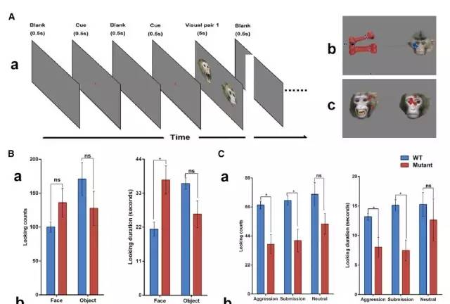 季维智教授与孙毅教授接下来与中科院昆明动物所胡新天研究员等进行合作,对MECP2基因突变猴开展了一系列针对瑞特综合征与自闭症谱系障碍的行为学检测。首先,他们发现在MECP2突变猴表现出睡眠障碍,出现更碎片化的睡眠状况。在瑞特综合征中睡眠障碍问题是非常突出的临床症状之一。其次,研究团队发现MECP2突变猴出现了一系列自闭症样症状,如主动社交接触变少、刻板样行为变多等。这些自闭症样行为在MECP2转基因猴中也有报道(8)。季维智教授与孙毅教授的团队更进一步,对MECP2基因突变猴进行了一个更令人信服的实验。我们知道自闭症孩子通常不与别人目光对视,心理物理学家后来发现,如果对自闭症孩子进行严格的眼动跟踪实验,自闭症孩子通常对人脸或者有感情的人脸无动于衷。研究者对MECP2基因突变猴也开展了这个实验,这个实验需要对基因突变猴及野生对照猴进行长达数月的训练,才能让猴子安静的在椅子上坐着进行认知实验。研究者发现,MECP2基因突变猴明显降低了对有表情的猴脸的兴趣,对明显更有攻击性和屈服的猴脸表示没有兴趣,而对面无表情的猴脸予以更多的关注(见下图)。这个实验进一步令人信服地表明,猴类做为脑疾病的模型有小鼠模型无法比拟的优势。
