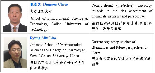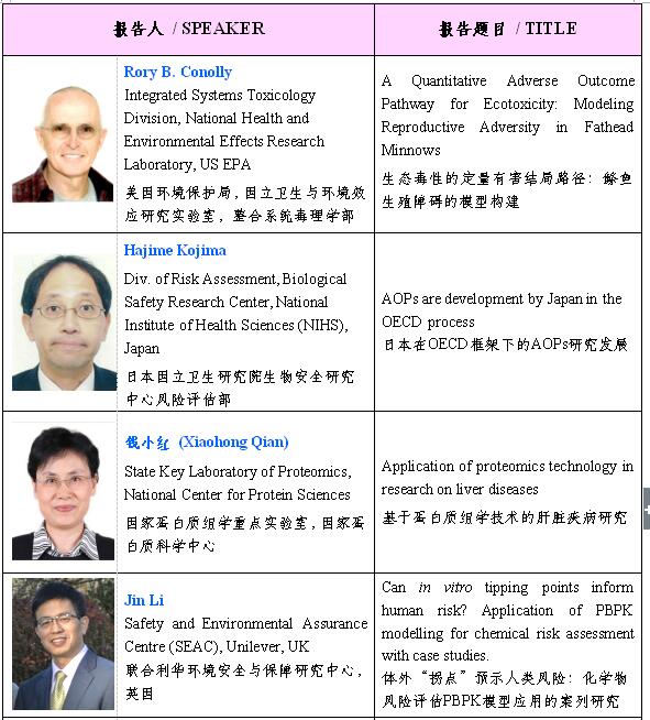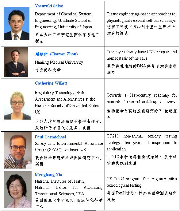 三、会议主要内容大会设主旨报告、大会报告、专题报告、壁报交流及培训班。主旨报告和大会报告将邀请美国、英国和日本等国内外毒性测试替代方法与转化毒理学领域的资深专家做报告。专题报告主要为国内外相关领域的中青年专家,同时还将开展“青年优秀论文奖”评选活动(1977年1月1日后出生的青年代表)。会议语言为中文或英文。会议征文内容主要包括(但不限于)以下主题。主题I.3Rs原则与实验数据质量3Rs原则的宣传与培训;伦理技术审查原则与实施;仁慈终点的选择与优化;动物实验替代技术;数据评价与质量控制;麻醉及无痛技术的发展;应激生物学与应激控制;基因修饰与转基因工程动物。主题II.化学品、化妆品、食品及药品毒理学替代法的认可与应用毒理学替代方法的构建;毒理学替代法的验证与认可;数据认可与法规管理;皮肤致敏反应评估新方法;生殖发育毒性评价;靶器官毒性评价;致癌性评价;生物新材料风险评价。主题III.现代毒理学测试新技术暴露科学及评估技术;毒物暴露与疾病风险的关联性研究;计算毒理学与毒性预测;高通量筛选;高内涵成像与分析;细胞3D培养;微流控技术。主题IV.毒理学评价模型的建立与应用化学物特征分析(QSAR模型等);毒作用剂量-效应评估模型;体内-体外数据外推(PBPK等);化学诱导疾病动物模型;干细胞及虚拟器官模型;体外代谢模型;数据交叉参比;毒理学关注阈值。主题V.系统生物学与毒理学大数据毒理“-组学”技术及应用;生物信息学及技术;AOP评估数据权重分析;毒性通路网路数据分析;数据整合与决策;毒理学数据库的应用;数据验证与互认。主题VI.毒性通路与靶毒性效应毒性通路的识别与描述;毒作用模式(MOA)与靶毒性效应;AOP的构建与应用;生物标志物;剂量-效应反应评估;细胞凋亡与自噬;氧化应激与炎症反应。四、部分已确定的学术报告