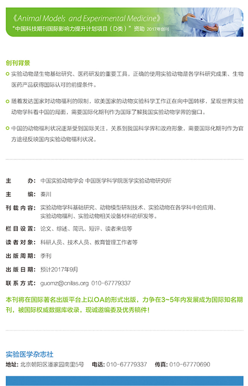 在生命科学瞬息万变的今天,实验动物科学技术发挥着举足轻重的作用。该学科的国际化是我国实验动物资源、学科研究成果、生物医药产品获得国际通行证的前提条件。目前,随着发达国家对动物实验的限制,欧美国家的动物实验科学工作正在向中国转移,呈现世界实验动物学科看中国的局面,需要国际化期刊作为国际了解我国实验动物学界的窗口。尤其,中国实验动物福利状况逐渐受到国际关注,关系到我国科学界和政府形象,需要国际化期刊作为官方途径便于国际了解国内实验动物福利状况。为此,中国实验动物学会近年来一直筹划创办一本知识产权属于我国的英文期刊,旨在填补我国实验动物科学领域英文期刊的空白。同时,发表实验动物科学领域最新的研究成果,方便国内外该领域专家及相关科研人员之间的交流,推动生命科学发展。2016年,经过精心准备及领导的大力支持,《中国实验动物学报》编辑部荣获中国科技期刊国际影响力提升计划项目资助,于2017年出版期刊Animal Models and Experimental Medicine。现诚邀全球实验动物科学领域及其他相关领域的专家加入编委会团队,凡符合以下条件的专家、学者均可报名,也欢迎诚聘专家互相举荐。要求:*必须有高尚的学术道德水平和认真踏实的科学态度。*有较高的学术水平,在相关专业领域有较深的造诣,能够掌握有关学术动态,对稿件做出客观公正的评价。*为该研究领域的领头人或专家学者,具有高级职称,有文章发表于相关研究领域影响力较高SCI期刊的经历和成绩。*聘任期限为3年。职责:*执行办刊方针和编委会的决议,参加编委会的会议和活动。*积极组织稿件(委员在每届任期内至少每年投稿一篇或推荐投稿,并是主持的重大项目内容一部分)。*按杂志规定要求完成审稿任务。*及时向编委会、编辑部反映读者、作者对杂志的意见和建议。*做好杂志的宣传工作。欢迎满足要求的专家申请加入!申请者需将个人详细简历发送至邮箱guomz@cnilas.org 。经过甄选后,推荐首届编委40名。请下载:编委自荐表中国实验动物学会二〇一七年六月二十八日