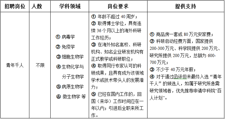 一、研究所简介中国科学院武汉病毒研究所座落于武汉市风景秀丽的东湖之滨,始建于1956年,是专业从事病毒学基础研究及相关技术创新的综合性研究机构。武汉病毒所具备良好的学术环境和一流的研究设施,拥有病毒学国家重点实验室、武汉国家生物安全(四级)实验室(简称“P4实验室”)和亚洲最大的中国病毒资源保藏中心等研究技术平台。武汉病毒所与一系列国际知名大学和科研机构建立了良好、稳定的合作关系,被科技部授予“国家级国际合作研究中心”。同时,武汉病毒所还建有设备齐全、服务优良的公共技术服务中心,将为科学研究提供强有力的技术支撑。中国科学院武汉病毒研究所热忱欢迎海内外优秀人才来所建功立业,共创美好未来!二、招聘信息