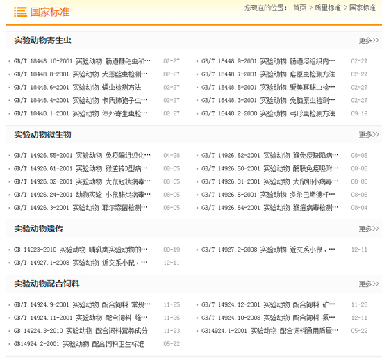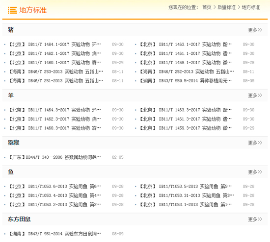中国实验动物信息网开设了实验动物质量标准栏目,其中包括实验动物国家标准、地方标准和行业标准等。为了便于大家快速查询相应标准,实验动物国家标准按实验动物微生物、遗传、寄生虫、配合饲料、环境与设施等进行了分类设置查询,实验动物地方标准按猪、牛、羊、猕猴、犬、鱼、猫、雪貂、树鼩、普通级鸡、设施设备、垫料、福利等进行了分类设置查询。目前实验动物国家标准基本可以全部查询,地方标准、团体标准在不断收集完善中。欢迎行业用户登录中国实验动物信息网质量标准栏目进行查询: