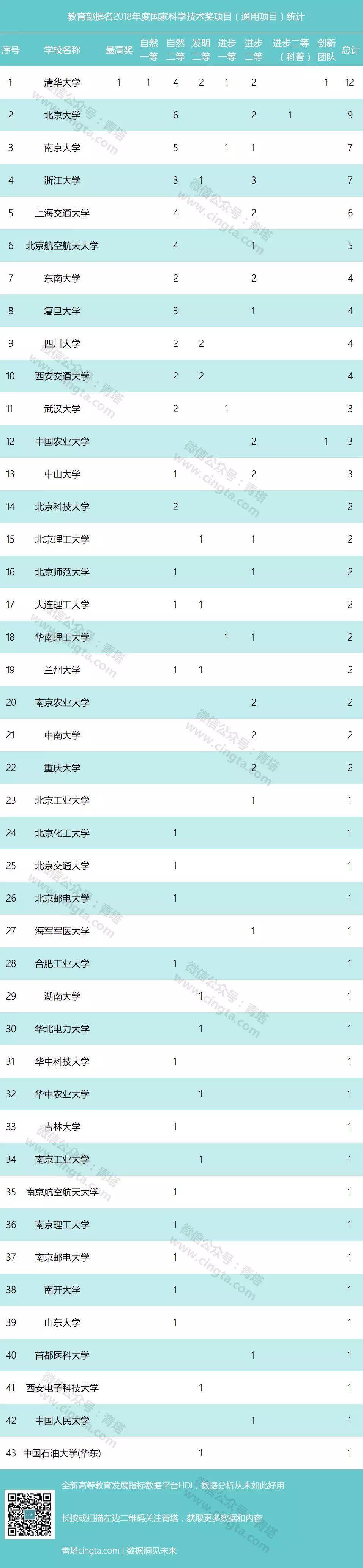 从教育部拟推荐201年8国家奖项目的第一完成单位上来看,清华大学最多,达到12项,包含1项最高奖、1项自然一等奖、4项自然科学二等奖、2项技术发明奖、1项科技进步一等奖、2项科技进步二等奖和1项创新团队奖。北京大学推荐项目共有9项,位居第二。南京大学和浙江大学推荐项目共有7项,并列第三。