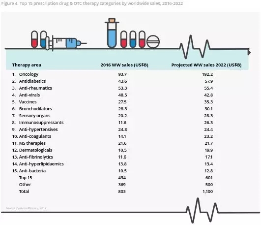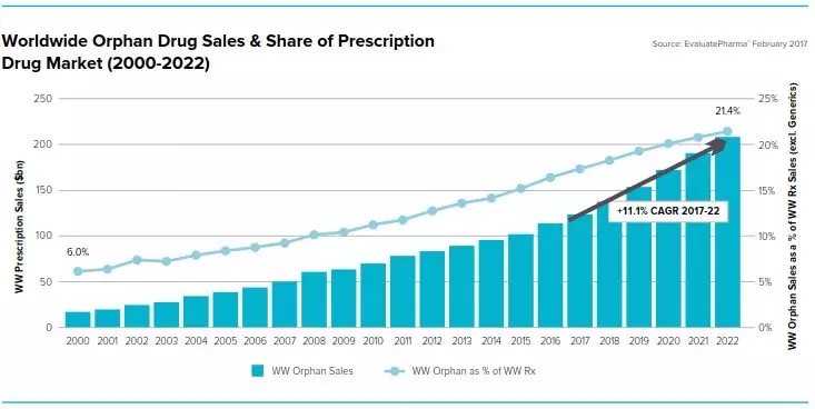 大多数以研究为基础的制药公司收入和利润将继续上升。未来几年,除了委内瑞拉,每个市场的处方药销售预计都将增长。消费方面的复苏将得到仿制药市场的进一步巩固以及对高价医药产品(包括孤儿药)预算增加的推动。仍有一些公司将苦苦挣扎于专利悬崖,预计在2022年,将有高达1940亿美元的处方药销售额会受到影响。整个行业将继续依赖新兴市场的增长。全球排名前20医药市场中,有8个新兴国家得益于日益壮大的中产阶级,在不久的将来,中国预计将进入前3名。然而,政府主导的降低医疗保健支出可能会约束市场的增长。2 孤儿药市场在未来5年将翻一番在接下来的5年,孤儿药市场预计将翻一番,在2022年达到2090亿美元。预计这些高成本的、专用药品已经、并将继续面临政策制定者的定价审查。在2016年,美国销售排名前100的药品中,孤儿药的平均治疗成本是每例患者每年14.0443万美元,而非孤儿药仅为2.7756万美元。