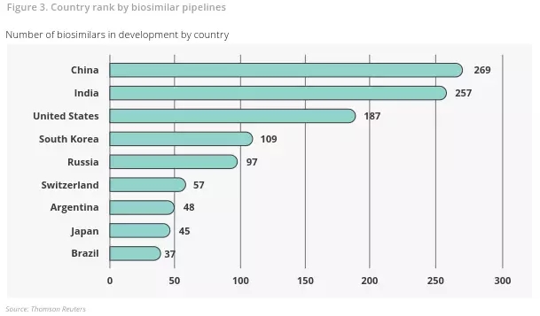 根据FDA,在2017年有75个孤儿药获批,而在2016年和2015年分别为27个和56个。在美国,2016年最畅销的50种孤儿药的平均销售额约为6.37亿美元,尽管只有大约600种孤儿药获批,但有多达7000种疾病被定义为罕见病。重大的科学进步将使得更多的罕见病被发现,以及更多的孤儿药寻求监管批准,同时也将面临着更大的定价压力。新的美国税法的通过,将生物制药公司的孤儿药研发负担有效降低了40%。然而,这一降低并不大可能改变生命科学公司的战略。孤儿药市场是一个解决未满足医疗需求的战略市场,关键的好处不仅仅是税收抵免,还有其他重要方面,如7年的市场独占权、更快的FDA审查和费用豁免等等。3 生物制剂在全球医药市场占比将超过1/4,生物仿制药在研数量中国第一过去几年,生物制剂在药品市场中已获得了显著增长。在2013年,生物制剂全球销售额为1500亿美元,而到2020年,这一数字预计将达到2900亿美元,在全球药品市场中的占比预计将超过四分之一,达到27%。与之而来的是,行业最畅销的生物制品将面临生物仿制药冲击带来的收入损失。对生物制剂支付能力及药品可及性方面的不足,将有力推动生物仿制药市场的增长,尤其是新兴国家地区。在欧盟,目前各国都在积极寻求通过生物仿制药来节省医疗成本,尽管目前生物仿制药的市场份额仍较低。价格方面,通常情况下,生物仿制药比品牌生物制剂低大约30%。在美国市场,对生物仿制药销售方面最大的影响是,预计在截止2020年的未来2年内,将有25-30个生物仿制药上市。然而,由于没有明确的调控途径,在美国也存在着逆风向。在研生物仿制药数量方面,亚太地区最多。按国家计,中国以269的数量位列第一。中国有潜力成为生物仿制药的前沿市场。生物仿制药的增长将有效提高生物制剂的使用,同时将推动整个行业进入一个创新期。生产制造技术方面的进步也正在被用于生物仿制药的生产。在未来几年,生物仿制药生产预计将占到一些公司全球生物制造容量的10%。