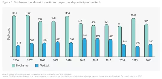 9 非传统、技术导向的邻接将是生命科学并购战略的重要方向在2017年,生命科学的交易价值较2016年进一步下降,原因是全球经济和政治的不确定性。在2017年所达成的大额交易,倾向于专注传统的收购方式,即被收购方在收购方的核心竞争力之内。根据汤姆森路透社的数据,到2017年第三季度最大的交易是贝克顿狄金森(BD)在4月份以242亿美元收购华润巴德(CR Bard)。生物技术行业则是吉利德111亿美元收购凯特制药(Kite),制药行业则是赛默飞世尔科技72亿美元收购Patheon NV。在2018年,生命科学交易容量和交易价预计都将有所上升,大宗交易数量也会增加,原因包括:(1)美国税改的通过、英国脱欧的进展、关于来自中国境外交易相关政策的成熟已扫除了在2017年制约生命科学并购的一些不确定性。美国税制改革为海外资金遣返提供了一些激励措施,这将能刺激并购交易的附加值。(2)资本市场依然坚挺:在2016年,横跨各行业的暗淡并购交易环境,抑制了通过并购交易创造价值的需求。(3)生命科学各环节仍然支离破碎,可通过进一步的行业整合来获得附加值。在2018年,对生命科学公司而言,非传统的、技术导向的邻接(adjacency)代表着并购战略的一个重要方面。技术与其他环节的融合已经受到来自技术行业参与者本身的有力推动。不过,受技术进步和技术投资的驱动,预计消费者健康、保健计划、医疗技术、制药各环节的参与者将积极地寻求并购交易。10 技术领域的指数进步促使医疗技术领域创新时机成熟在2017年,医疗技术风险融资交易的总价值涨幅较大,尽管交易数量有所下降。寻找新的技术来加速未来增长对于大型的成熟的医疗技术公司而言是一个挑战。技术领域的指数进步已使得医疗技术领域的创新时机成熟。传感器、分析、人工智能、其他数字健康技术正在与医疗技术融合。医疗技术公司有机会创造新的商业模式,从产品开发商转变为解决方案提供商。与传统的医疗技术相比,数字医疗技术似乎正在吸引更多的风险投资,同时也正在吸引着新类型的组织投资该领域。大型医疗技术公司合作伙伴关系正变成传统风险资本投资的替代品。不过,生物制药范畴的伙伴关系交易总量将是医疗技术伙伴关系的3倍。(新浪医药编译/newborn)