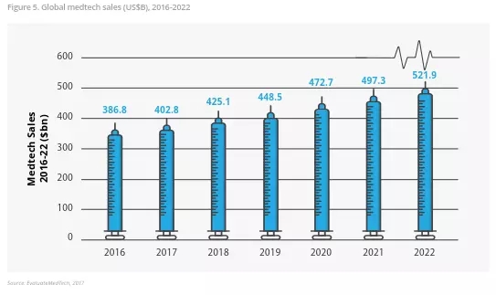整个行业预计将继续面临研发收益方面的挑战。将一种资产推向市场的成本在2017年达到了创记录水平,许多大型制药公司将继续面临仿制药的竞争。随着药品审批数量的增加以及审批速度的加快,引发定价竞争将是研发方面面临的一个新常态,这也意味着留给制药商获取实质性利润的时间更少。在2018年,美国FDA承诺在审批方面将进一步提速,但加速审批的风险最后可能变成药品在医药市场中的灾难。8 体外诊断仍将保持医疗技术领域最大板块未来几年,全球医疗器械销售额预计将以5.1%的CAGR增长,到2022年达到5219亿美元。体外诊断是预期将保持最大的医疗技术板块,到2022年的年销售额将达到700亿美元。排在第二位的是心脏病学,到2022年的销售额预计将达到620亿美元,之后是诊断成像480亿美元、骨科440亿美元。在2022年,全球排名靠前的10家公司预计在医疗技术市场中占据37%的份额。全球医疗技术研发支出预计将以3.7%的CAGR增长,从2017年的270亿美元增长到2022年的335亿美元。研发投入在销售额中的占比预计将下降,从2016年的6.9%下降至2022年的6.4%。最近的美国税改中,医疗器械消费税的废除并不包括在内,医疗技术行业认为,这一税收对医疗创新具有显著的负面影响。然而,该行业将继续推行替代性的立法措施。