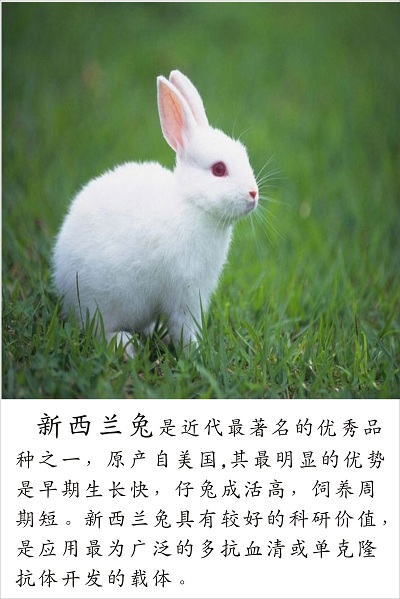 新西兰兔是近代最著名的优秀产品之一,原产自美国,其最明显的优势是早期生长快,仔兔成活高,饲养周期短。新西兰兔具有较好的科研价值,是应用最广泛的多抗血清或单克隆抗体开发的载体!苏州湖桥生物科技有限公司创立于美丽的太湖之滨临湖镇,公司目前已建成中国一流、国际领先的实验动物生产与示范基地,普通级、清洁级实验动物家兔的年产能超过10000只,占据华东多数市场份额。湖桥生物已引进具有国际丰富经验的优秀管理团队及先进的抗原抗体研究与开发技术,为国际客户提供一流的生物试剂及实验动物相关产品。基于公司创新的研发生产平台,湖桥生物也将面向全球客户提供包括原料抗体服务,多肽合成,重组蛋白或重组抗体的表达服务,以及检测服务等全方位一体化的技术服务。我们的口号是“通过采用国际化一流设施,为客户提供高品质的生物试剂与服务,打造中国自主的生物航母”,让我们竭诚为您服务。