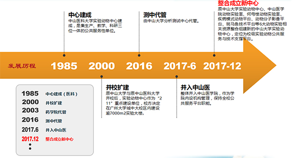 2017年6月,原中山大学实验动物中心、中山医学院动物实验室、何母楼动物实验室、疾病模式动物平台、动物分子影像平台、斑马鱼技术平台等6大动物实验相关资源统筹和整合,组建新的中山大学实验动物中心。