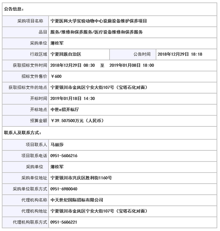 宁夏医科大实验动物中心设施维保项目招标公告