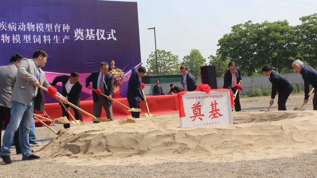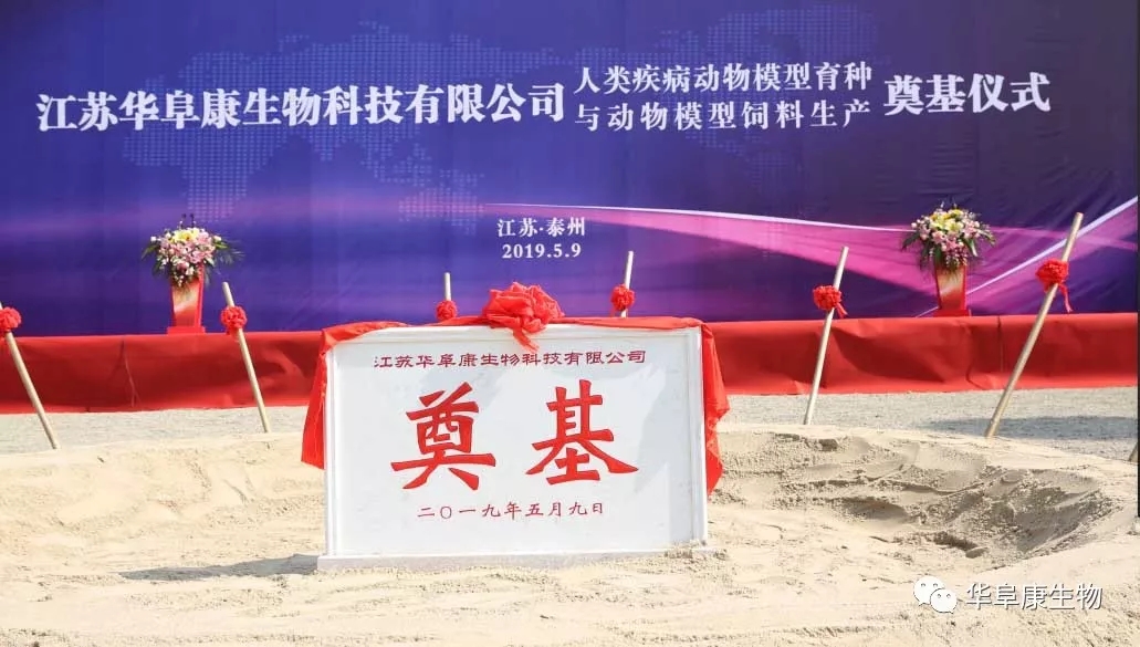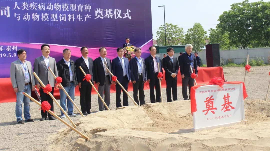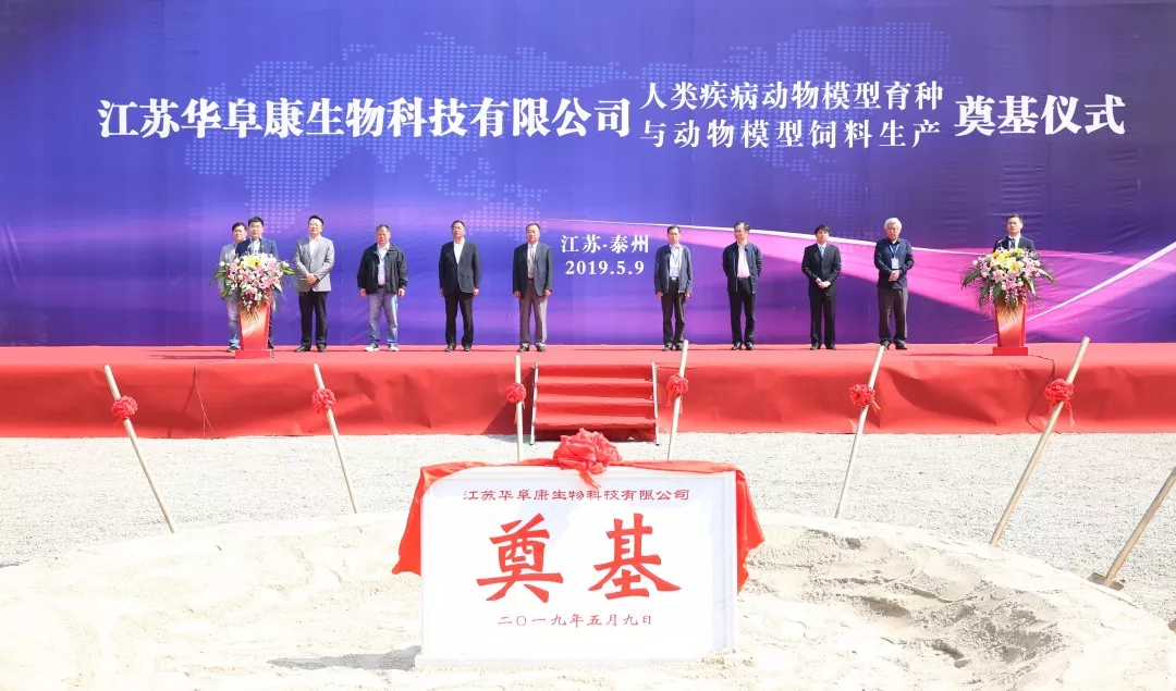 2019年5月9日9点,江苏华阜康生物科技有限公司人类疾病动物模型育种与动物模型饲料生产项目在江苏省泰州市中国医药城隆重奠基。仪式由北京华阜康生物科技股份有限公司总经理成兵主持,北京华阜康生物科技股份有限公司董事长刘云波致欢迎辞并介绍了江苏华阜康的情况,中国医学科学院医学实验动物研究所副所长刘江宁,泰州医药高新区党工委委员、管委会副主任,医药园区党工委书记、管委会主任陈锋剑分别致辞祝贺。军事科学研究院毒物药物研究所首席科学家廖明阳,北京实验动物协会理事长赵德明,江苏省实验动物协会会长肖杭,上海实验动物研究中心副主任范春,江苏省食药监局医药高新区直属分局局长,医药高新区党工委委员、管委会副主任姚志宏,泰州医药园区党工委副书记、管委会副主任吴翔,泰州医药园区管委会副主任李哲,以及中国医药城相关部门的领导、华阜康生物的领导及来自全国各地的100余位领导、专家、企业家出席。