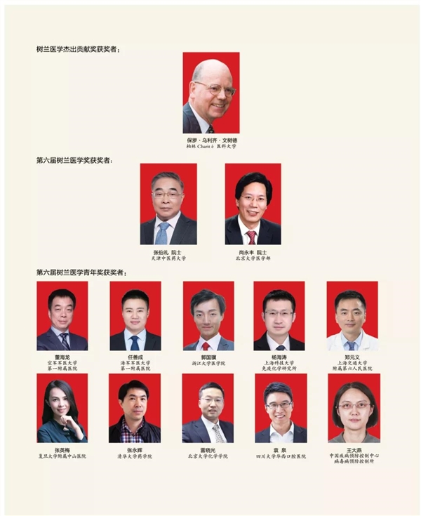 2019年11月16日,被誉为中国医学界“诺贝尔奖”的第六届“树兰医学奖”颁奖盛典在杭州良渚文化发源地隆重举行。柏林Charité医科大学保罗•乌利齐•文树德教授荣获“树兰医学杰出贡献奖”(奖金100万人民币)。张伯礼院士与尚永丰院士荣获 “树兰医学奖”(每人奖金50万人民币)。董海龙、任善成、郭国骥、杨海涛、郑元义、张英梅、张永辉、雷晓光、袁泉、王大燕10位青年才俊摘取“树兰医学青年奖”。全国人大常委会副委员长陈竺院士、树兰基金理事长郑树森院士和李兰娟院士出席本次颁奖大会并向获奖者颁发奖杯、铭牌、荣誉证书。