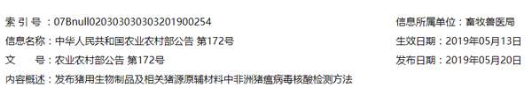 中华人民共和国农业农村部公告 第172号为确保兽用生物制品质量安全,防止非洲猪瘟病毒污染相关制品,根据《中华人民共和国动物防疫法》《重大动物疫情应急条例》《兽药管理条例》等法律法规规定,自2019年5月25日起,各兽用生物制品生产企业(以下简称“生产企业”)应对兽用生物制品生产过程中使用的毒种、原辅材料、半成品、成品等全面开展非洲猪瘟病毒核酸检测,并做好检测结果报送和后续处置工作。现就有关事项公告如下。一、生产企业开展非洲猪瘟病毒核酸检测至少应包括以下范围:(一)猪用及采用猪源原辅材料制备的生物制品成品及半成品;(二)猪源毒种;(三)猪源细胞及相关制品生产用细胞;(四)其他猪源原辅材料(如组织、血清、胰酶等)。二、样品的取样和处理、核酸提取、检测,按照猪用生物制品及相关猪源原辅材料中非洲猪瘟病毒核酸检测方法(见附件)或我部批准的商品化检测试剂盒说明书进行。三、对猪源生物材料和毒种的检测结果应记录在相应产品的批记录中,由生产企业归档留存;对猪用生物制品的检测结果,除需记入批记录外,还应随批签发报告报中国兽医药品监察所。四、一旦检出非洲猪瘟病毒核酸阳性样品,生产企业应立即停止生产,销毁该批成品、半成品、毒种、原辅材料,进行彻底消毒,并在24小时内报生产企业所在地省级畜牧兽医行政管理部门;省级畜牧兽医行政管理部门应及时组织开展追溯调查,并及时报农业农村部畜牧兽医局,同时抄报中国兽医药品监察所。对检出的阳性样品及相关产品、原辅材料、细胞、毒种等风险物品,生产企业要按要求及时进行无害化处理;经彻底消毒并对换批的毒种、原辅材料进行非洲猪瘟病毒核酸检测合格后,生产企业方可恢复生产。对在追溯调查中发现的有关情况,省级畜牧兽医行政管理部门要按规定进行严格处置。五、生产销售污染非洲猪瘟病毒的兽用疫苗的,应按《兽药管理条例》第五十六条“生产、经营假、劣兽药”情节严重进行从重处罚,吊销兽药生产许可证和经营许可证;因生产销售污染非洲猪瘟病毒的兽用疫苗造成疫病传播的,还应按有关法律规定依法追究刑事责任;给他人造成损失的,依法承担赔偿责任。附件:猪用生物制品及相关猪源原辅材料中非洲猪瘟病毒核酸检测方法农业农村部2019年5月13日附件:农业农村部公告172号.ceb附件-猪用生物制品及相关猪源原辅材料中非洲猪瘟病毒核酸检测方法.doc原文链接:http://www.moa.gov.cn/govpublic/xmsyj/201905/t20190520_6309715.htm 农业农村部:兽用生物制品将全面开展非洲猪瘟病毒核酸检测