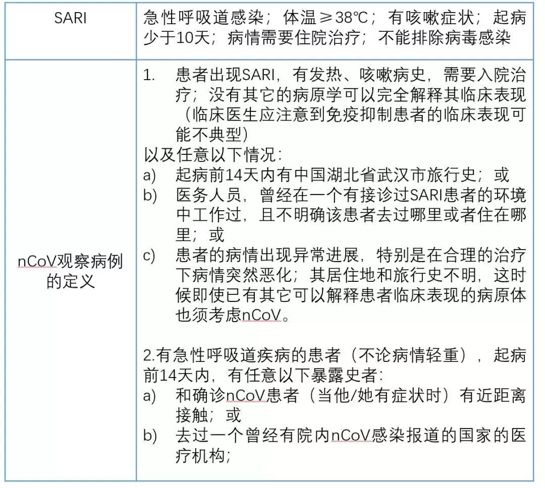 表1:SARI患者(疑似nCoV)的定义
