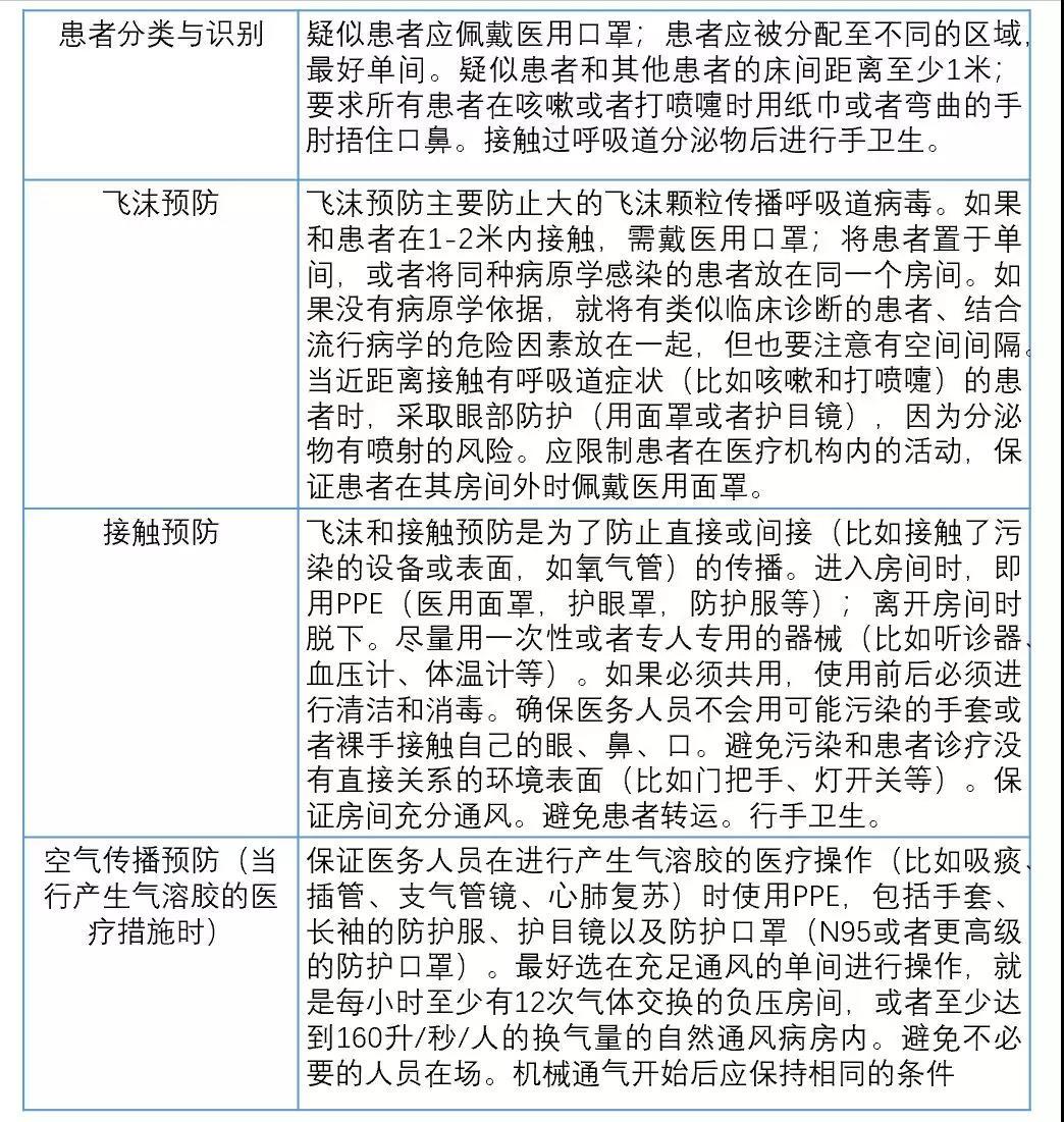 注意:nCoV病情可以表现为轻、中、重度,后者包括重症肺炎、ARDS、脓毒症和脓毒性休克。早期识别疑似患者为及时启动IPC提供了时间(见表2)。早期识别有严重临床表现的患者(表2),可以对患者采取及时有效的支持治疗,并可以根据标准流程快速、安全地转入ICU。对于轻症患者,可能不需要住院治疗,除非临床考虑有快速加重的可能。所有回家观察的患者都应该要求其一旦出现任何疾病的恶化表现应立即回到医院。
