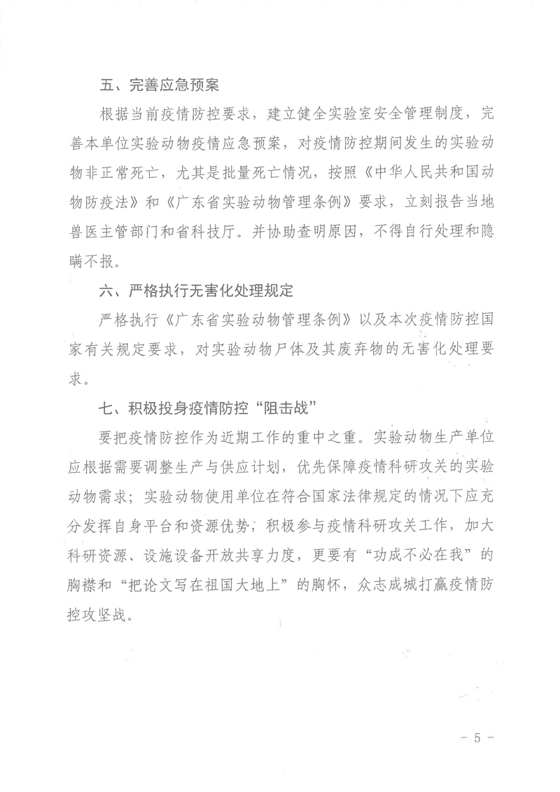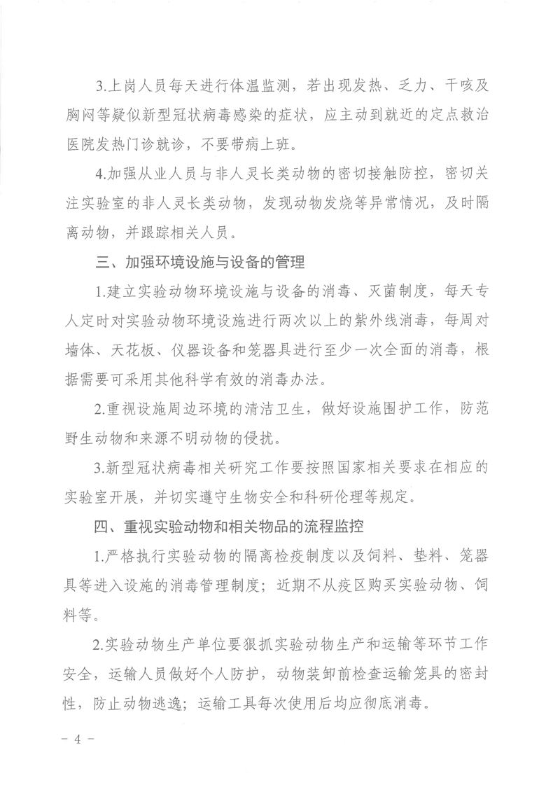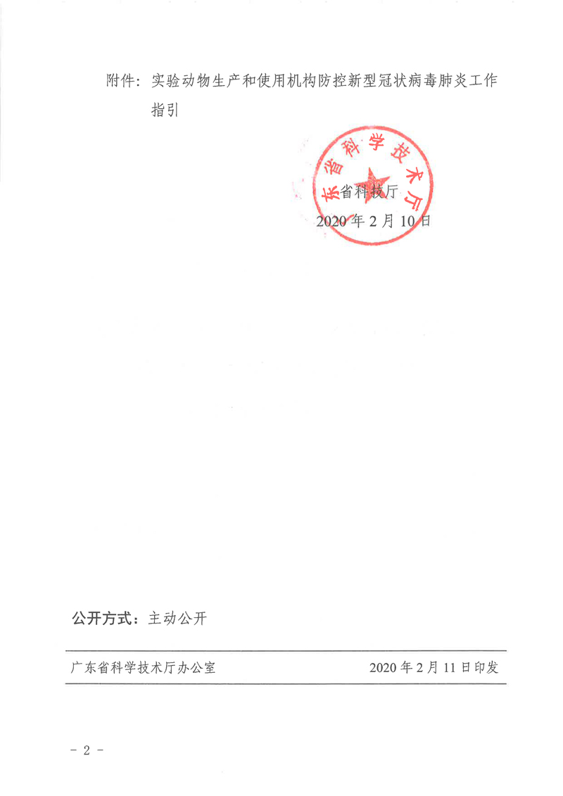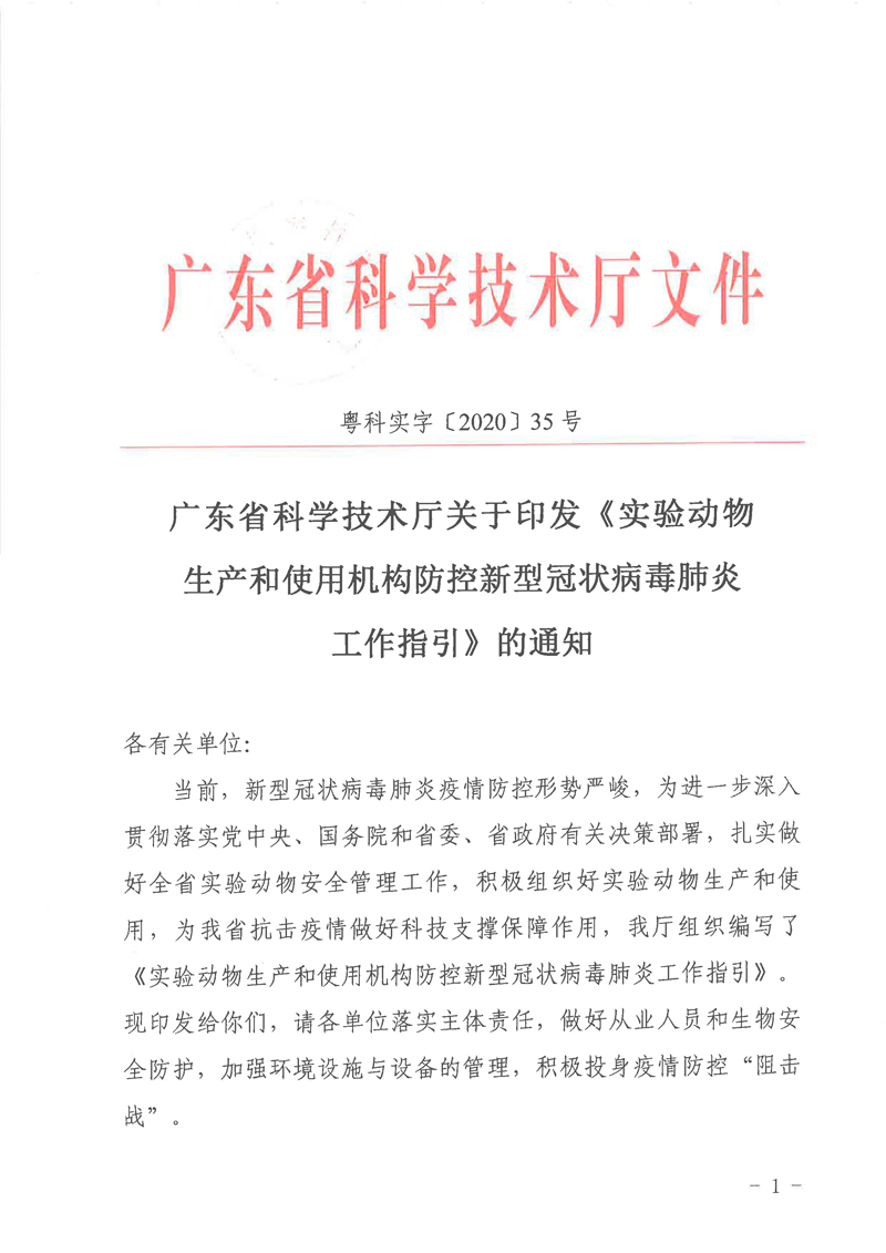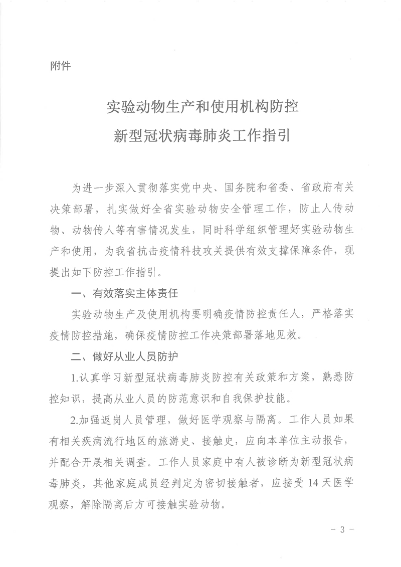 当前,新型冠状病毒肺炎疫情防控形势严峻,为进一步深入贯彻落实党中央、国务院和省委、省政府有关决策部署,扎实做好全省实验动物安全管理工作,积极组织好实验动物生产和使用,为我省抗击疫情做好科技支撑保障作用,我厅组织编写了《实验动物生产和使用机构防控新型冠状病毒肺炎工作指引》。现印发给你们,请各单位落实主体责任,做好从业人员和生物安全防护,加强环境设施与设备的管理,积极投身疫情防控“阻击战”。