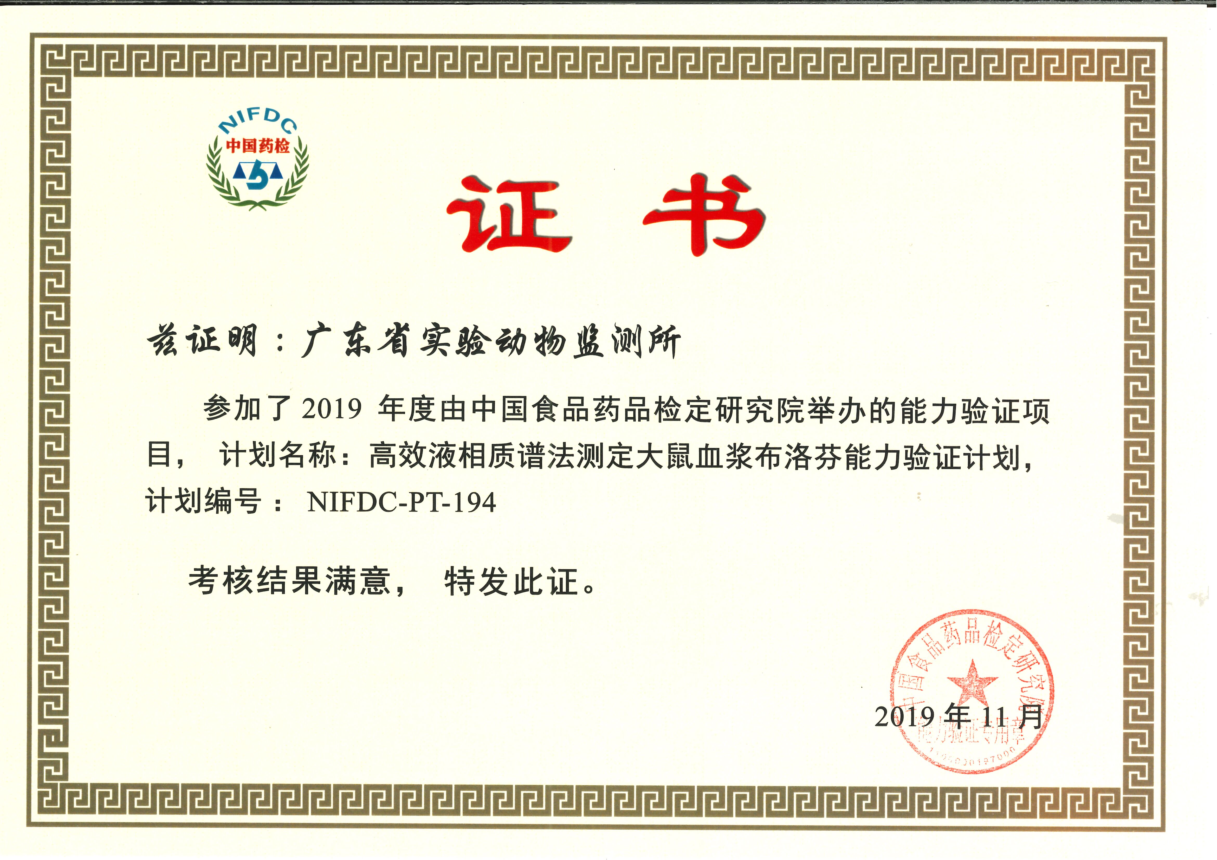 广东省实验动物监测所广州科学城-春盛药物评价中心(以下简称中心)顺利通过2019年度由中国食品药品检定研究院举办的能力验证项目,结果满意,获得证书!这已经是中心连续两年(2018年度、2019年度)参加中国食品药品检定研究院举办的能力验证项目(HPLC法药物浓度能力验证、HPLC-MS法生物分析能力验证),并获得认可,可喜可贺!