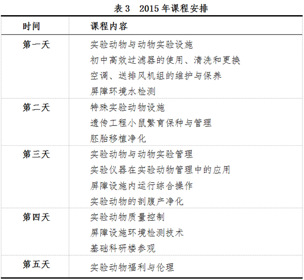 培训班的课程设计包括理论与实践两部分。理论学习包括国家和北京市有关实验动物的法规;实验动物屏障设施概述;屏障设施建设原则及注意事项;感染动物实验屏障设施操作运行管理;屏障设施运行前的准备;屏障设施的维护与保养;屏障设施内饲养人员操作要求及规范;屏障设施内实验人员操作要求与规范;一般实验动物生产和使用单位的经济运行模式及日常管理办法等。实习内容包括动物设施机房设备日常运行与使用维护;屏障设施内运行综合操作运行、环境检测技术;实验动物的剖腹产净化及胚胎移植净化和体外授精等。(见图1、图2)课程设计不是一成不变的,根据实验动物科学的新进展、新理论及相关标准的调整,不断对培训内容进行调整,使其与时俱进;并根据当今科研实验对实验动物及动物实验技术的新要求,适当引入与实际业务工作相结合的与屏障设施密切相关的操作实验,注重融入实验动物学科发展的最新科研成果,渗透相应的理论和技能。(见表1、表2、表3)