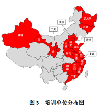 三、培训实施与取得成果(一)推广设施运行管理方法和经验自2001年12月举办了首期“实验动物屏障设施运行与管理”培训班,截至2018年11月,首都医科大学实验动物部共累计举办 “北京市实验动物屏障设施运行与管理培训班”30期,274个单位,共培训学员483人。其中,北京地区371人,单位182个,已覆盖北京地区目前实验动物屏障设施单位的90%以上;外省市132人,92个单位,包括天津、上海、福建、安徽、河南等20个省市,辐射华北、华东、华南、东北、西北、西南等地区,为全国培养了大批屏障设施管理人才。(见图3)参加培训单位的级别和类型包括了实验动物生产和使用的各种类型。(表4、表5、表6)