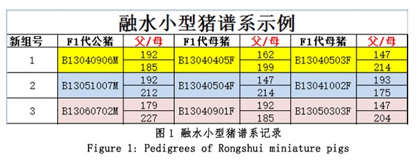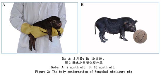 编者:资源增量是实验动物科技发展的核心任务,是实验动物对生命科学研究提供支撑和服务的基础和保障。自上世纪80 年代以来,我国老一辈实验动物科学家苦心孤诣,在实验动物资源研发工作中取得的多项开创新成果。1988 年《实验动物管理条例》发布实施,在实验动物工作规范化、法制化管理,保障实验动物和动物实验的质量,推动我国科技发展和民生保障等方面发挥了重要作用。特别是在实验动物资源标准化、新品种/品系开发和动物模型创制方面,取得了令人瞩目的成果。为此,借“科技资讯”之窗,陆续推出我国实验动物专家在此领域所作的工作及取得的应用成果。融水小型猪的标准化与应用唐小江1,2 施赫赫2(1.珠海百试通生物科技有限公司,珠海,519040)(2.广东省医学实验动物中心,佛山 528248)摘要 融水小型猪的种源来自广西融水县苗寨,2012 年5 月被引种到广东,课题组将其建立基础群繁育至今。期间对该猪种的种质特性、线粒体DNA 结构和系统进化、体重与体尺、血常规、血生化与电解质指标、主要脏器及自发性病变组织学、群体遗传结构等基础数据进行研究。参照北京地方标准,在饲养繁育过程中初步建立了融水小型猪微生物与寄生虫、环境与设施、饲料、病理学、遗传学等质量控制标准。上述研究表明融水小型猪是中国传统猪种中比兰屿猪更为古老的猪种,能适应广东当地气候,繁殖良好,体型小,性情温驯,通过标准化的饲养管理与质量控制,具有培育成实验用小型猪的基本条件。融水小型猪应用于世界首例亨廷顿舞蹈症基因敲入猪的成功研究,说明在科研应用上具有一定的价值。我国具有丰富的小型猪资源,数十家机构对近10 种小型猪开展了实验动物化研究,培育出五指山小型猪、版纳微型猪、贵州小型猪、巴马小型猪、中国农大小型猪、西藏小型猪、蕨麻小型猪等实验用小型猪[1-7]。本课题组在广西融水县苗寨发现了一种体型小、性情温驯的小黑猪。课题组于2012 年5 月将该品种引种到广东佛山三水乐平镇的小型猪基地进行实验动物标准化研究。现将系列研究情况及应用作一概述。1、融水小型猪的来源融水小型猪的种源来自广西壮族自治区融水县杆洞乡百秀村苗寨。该猪在当地被称为“香猪”、“大苗山香猪”、“苗猪”、“融水黑香猪”等。该苗寨地处崇山峻岭之中,交通十分不便,因此该猪是近亲繁殖,基本没有引入外来基因,经过数千年繁育,遗传性状稳定,属于自然形成的典型封闭群。2、引种、繁育、标准化管理2010 年,基于当时尚无该猪种质资源特性的研究报道的情况,本课题组决定引进该猪种,希望通过实验动物化,将该猪种驯化成医学实验小型猪并推向科研市场。2010 年~2012 年, 课题组在三水乐平镇选好猪场场址,兴建起小型猪猪舍。2012 年5 月,从融水县开始分批引进融水猪。经过4 次引种,在2012 年12 月,成功建立了基础种群130 头(F0 代),其中公猪10 头,母猪120 头。当月开始,对F0 代种猪进行配种繁育。经过约4 个月的时间,F0 代母猪基本完成第一次配种。至2014 年3 月,F1 代母猪约保有570 头,公猪约保有510 头。在此期间,以实验用小型猪北京地方标准(DB11/T 828.1、2、5、6-2011)作为参考依据,进行繁育管理,定期进行免疫接种和驱虫,并进行检测。依据标准定制生长料,哺乳料及维持料,开食料则采用厂家提供的教槽料。环境及设施方面,为融水小型猪建造封闭式猪舍,门窗加装防蚊纱窗,防鼠挡板。利用湿帘通风系统和局部保温灯控制舍内温湿度。排污采用环保处理,设计为雨水与粪尿污水分流。建立融水小型猪的谱系记录,用于查明猪群血统关系,近交的有无和程度。融水小型猪采用横式系谱格式记录,猪只编号规则为公司代号+出生年月+当月第X 窝+每窝第X 只+性别,如B13040906M,表示广东贝格生物科技有限公司小型猪基地2013 年4 月出生的第9 窝的第6 只,为雄性。示例见图1,每一组为1 只公猪配2只母猪。由于实验用小型猪封闭群的建立需要至少4 代[8],实验动物化的过程长,投资大,在资金遇到困难的情况下,2015 年课题组决定将F1 代种猪进行少量活体保种至今。3、融水小型猪种质特性3.1 体型外貌融水小型猪体型外貌见图2。该猪体躯矮小,被毛全黑,少量有唇白和肢端白。头较大,面平直,额面有纵行皱纹,耳较小薄,略向前伸,稍下垂或两侧平伸。颈部短而细,背腰平直或微凹,腹较大下垂但不拖地,尾巴细长。母猪乳头多为5~6 对,少量能达到7 对。后躯丰满,四肢短细紧凑,肢端常见为卧系[9]。3.2 繁殖性能母猪发情症状明显,一个情期的自然交配受孕率较高,约88. 3%;引进母猪配种后妊娠期平均112 d,初产平均胎产仔6.1 头,活仔数5.9 头;经产平均产仔7.9 头,活仔数5.9 头。仔猪45~60 天龄断奶[9]。4、标准化研究4.1 线粒体DNA 结构和系统进化的分析2012 年8 月,选取了全基因组鸟枪法的测序策略对F0 代雌性融水小型猪的外周血液样本进行测序,使用Illumina 基因组分析测序技术构paired-end 文库进行末端测序,最后进行拼接及分析。结果显示融水小型猪的完整线粒体序列呈环形,总长为16888 bp,由13 个编码蛋白基因、22 个转运RNA 和两个核糖体RNA 构成。线粒体DNA 的GC 含量约为44 %。通过系统进化分析、遗传多样性分析和中性检验,证明在融水小型猪、兰屿猪、海南野猪和滇南7 号这一类群中,发生了种群扩张。该项研究表明融水小型猪是中国传统猪种中比