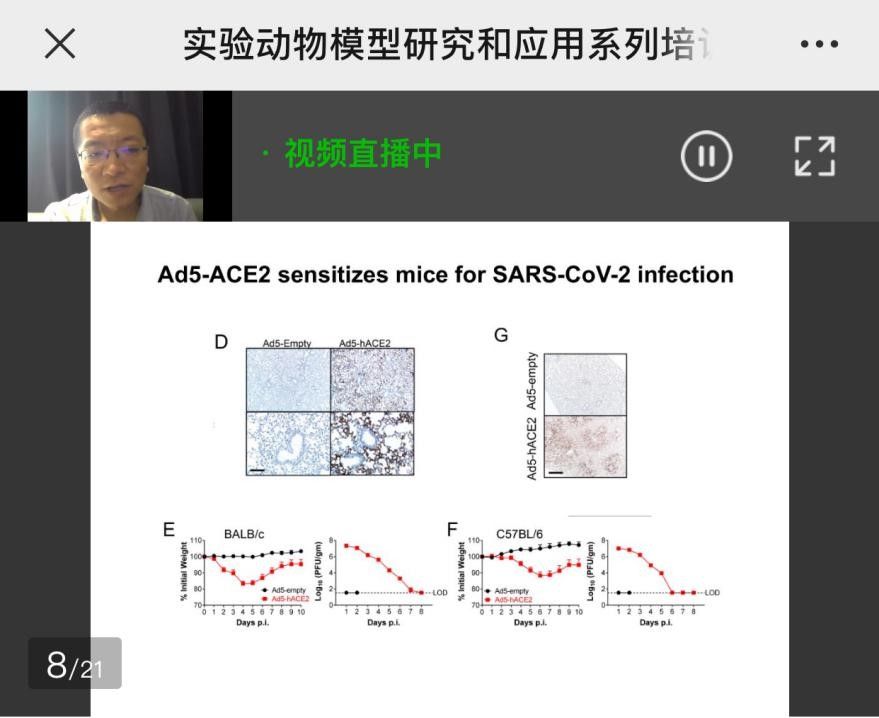 2020年8月9日上午,培训邀请到广州医科大学赵金存教授,讲授了“Generation of a Broadly Useful Model for COVID-19 Pathogenesis Vaccination, and Treatment”。赵教授在课程中主要介绍了用腺病毒转导的方式构建非转基因小鼠新冠肺炎动物模型的过程,并详细介绍了此模型的研究背景,模型的构建原理以及一些优势。