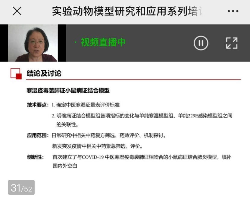 培训还邀请到中国中医科学院崔晓兰教授,讲授了“人类冠状病毒肺炎寒湿疫毒袭肺证小鼠病症结合模型的建立”。崔教授在课程中主要介绍了做该研究的意义与目的,详细介绍了人冠状病毒(HCoV-229E)感染BALB/c小鼠肺炎模型的构建过程,得到的结论与讨论的过程,介绍了模型的应用及药物验证,同时,对工作基础及条件进行了详细的说明。