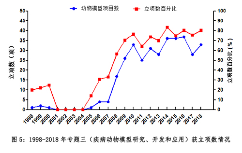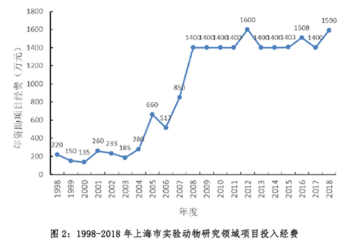 编者:《实验动物管理条例》(以下简称条例)是我国第一部实验动物管理行政法规。《条例》的发布标志着我国实验动物工作依法管理进入了新的阶段,《条例》的实施为实验动物工作的快速有序发展提供了有力保障。《条例》的发布实施,确定了实验动物在科技发展中的重要地位,全面规定了我国实验动物工作发展方向、目标和任务,为实验动物科技立项工作的发展营造了良好的环境,为实验动物科学研究工作的实施提供了有力保障。在科技项目的支持下,经过实验动物科技工作者的不懈努力,攻克了诸多制约实验动物资源开发和标准化等方面的瓶颈问题,对实验动物科技发展具有里程碑意义。“九五”期间,“实验动物模型培育和标准化技术研究”作为“九五国家科技攻关课题”列入国家重点科技攻关计划项目“科学仪器和实验条件研究与开发”[3]。这是科技部主管实验动物工作以来的第一个国家级科研课题。“十一五”至“十二五”期间,通过国家科技支撑项目、国家自然科学基金项目、“重大新药创制”和“艾滋病和病毒性肝炎等重大传染病防治”科技重大专项,以及“十三五”畜禽重大疫病防控与高效安全养殖综合技术研发重点专项等科技项目的实施,对丰富我国实验动物遗传资源、提升实验动物质量保障能力和技术水平发挥了积极的推动作用。为此,借“科技资讯”之窗,介绍我国实验动物科技项目的实施与取得的成果。上海市“科技创新行动计划”实验动物研究领域项目实施与成果分析在生命科学和医学研究中,人类的健康和福利研究离不开实验动物。实验动物学现在已经成为现代科学技术不可分割的一个组成部分,已形成一门独立的综合性基础科学门类[1]。实验动物作为相似度高、可控性强、使用经济、操作简便的生命模型,广泛运用于生命科学各领域,成为继试剂、仪器和信息之后,生命科学研究不可替代的第四大必备条件[2]。当前正处在全球化科技创新技术革命的非常时期,生物工程、微电子技术、新材料、新能源、人工智能等正在迅速发展。由科技部社会发展司与中国生物技术发展中心发布的《2017 中国生命科学与生物技术发展报告》显示,“十二五”以来,中国生物产业发展迅速,其复合增长率达到15%以上,其产业规模到2020 年有望达到8 万亿至10 万亿元,生物产业增加值占GDP 的比重将超过4%[3]。实验动物是活的模型和仪器,对于促进生物前沿技术研究、新药研制和相关产品开发至关重要。为进一步提升上海科技创新能力,加快建设具有全球影响力的科技创新中心,推进上海实验动物领域科技进步,提高实验动物质量,提升动物实验技术水平,满足国家及地方生物医药前沿技术研究和产业发展实际需要,加强和完善上海实验动物资源公共服务平台的功能,推进上海的生命科学研究和生物医药产业的进一步发展,上海市科学技术委员会根据国家和上海的中长期科技发展规划,从1998 年开始实施了实验动物研究专项,并根据生命科学研究和生物医药产业发展规模逐渐加大“科技创新行动计划”实验动物研究领域项目的投入。一、项目管理上海市“科技创新行动计划”实验动物研究领域项目由上海市科学技术委员会设置,发展计划处和条件财务处主管,具体项目管理中心设在上海实验动物研究中心。专项主管部门按照财政资金管理要求,对项目实行每年申报制,通过“公开征集项目-编制指南-网上发布指南-接受本市注册的具有独立法人资格的企事业单位申报-在线受理项目可行性方案-形式审查-网上专家评审-立项审核-立项发文-任务书填报-任务书审核-合同审签-项目转正-首期拨款-项目进展情况检查-项目验收”的流程有序推进专项的实施管理,保证了专项的顺利实施。二、项目资助概况及发展分析从1998 年至2018 年这二十年上海市科委的共支持了513 项实验动物研究领域项目的研究(图1),资助总经费达1.917 亿元(图2)。