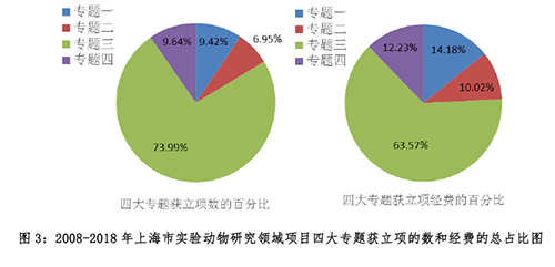 从图1 和图2 中年支持的项目数和投入的经费情况,结合各年具体研究方向的内容可以将上海市“科技创新行动计划”实验动物研究领域项目的发展可分为三个时期:1. 项目资助初期、模式探索阶段:1998 年至2004 年,共资助35 项项目,年均5 项,年均资助经费209万元,主要资助实验动物资源保存和质量检测技术的研究,呈现出资助数量相对少、支持经费不多和资助方向较单一的特点;2. 项目资助成长期:2005 年至2007 年,共资助32 项项目,年均资助约为11 项,年均资助经费676 万元;除实验动物资源保存和质量检测技术外,还资助人类疾病动物模型建立及相关技术研究、基础性的研究、数据库的建立和实验动物相关技术的研究,呈现出资助投入进一步加大,研究方向多元化的特点;3. 项目资助成熟稳定期:2008 年以后,上海市科委对实验动物专项项目的资助发生了质的增进,并维持相对稳定,逐渐形成四大专题的研究内容(表1),每年支持项目30 个以上,年资助经费1400-1600 万元。后续的细化分析将以此阶段(2008 年至2018 年)的项目为主。
