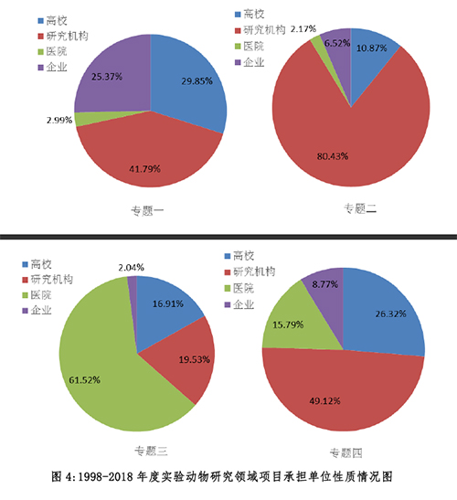 (二)专题承担单位分析对1998 年至2018 年实验动物研究领域项目承担单位获资助情况进行统计,共资助70 多家单位。从专项的各项目承担单位的性质情况来看,由高校、研究机构、医院和企业承担的项目分别为98 项、160 项、223项和32 项,其中(图4):专题一(实验动物资源保存、开发及应用研究)项目主要由研究机构承担(41.79%),高校和专业的实验动物公司也承担了一定比例的项目,医院承担的项目相对较少;专题二(实验动物质量检测技术与质量控制研究)的承担单位主要分布在研究机构(80.43%),少数由高校、医院和专业的实验动物公司承担;专题三(动物模型研究、开发和应用)主要由医院承担(61.52%),研究机构和高校次之,专业的实验动物公司承担的项目较少;专题四(实验动物福利、替代及相关技术研究)的承担单位分布相对均匀,以研究机构(49.12%)为主,高校和医院次之。